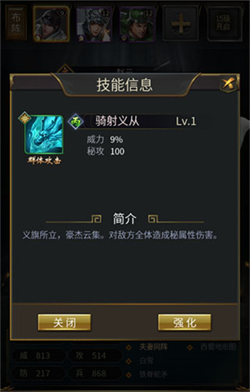 3. 武将技能 武将技能堪称一大亮点。每个武将的技能,在伤害与效果方面都截然不同,并且特效绚丽夺目,能为玩家带来淋漓尽致的战斗体验。 武将品质越高,其拥有的技能越出色,技能种类数量也存在差异。从技能类型来看,可分为单体攻击、纵列攻击、横排攻击、爆炸攻击、群体攻击、单体治疗、群体治疗等;从属性类别划分,则有 水攻、火攻、秘攻、治疗等。技能的具体数值与武将的品级以及技能等级相关。
