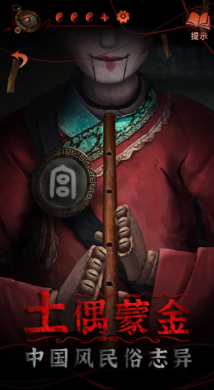 18、切换到二更场景,将【胭脂盒】放到木偶戏台上,拿到【梆子】,获得需要红线的提示。将【梆子】放到黑无常手里,用【锣棒】依次敲击锣、梆子、锣,切换到三更场景(无常贴脸高能)。点击进庙,点击元宝上的机关,解开机关拿到【一串铜钱】。