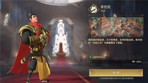 在游戏刚开始的时候,游戏玩家需要先选择自己的英雄阵营,不同的英雄所带来的加成也是不同的。比如在英雄的选择上有阿拉伯英雄拜波尔斯,这个文明特性的加成是石头的产出增加20%;有中式英雄李世民,民以食为天,所以这个文明的加成就是粮食的产出增加20%;有法式英雄贞德,文明特性加成是木材的产出增加20%;有罗马式的西庇阿,文明特性加成是银块的产出增加20%,等等。