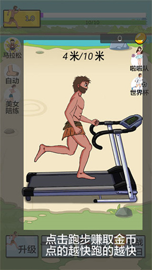 2、夸父在跑步机上跑步,初代跑步机10米获得金币奖励,点击屏幕的速度越快,跑的就越快。