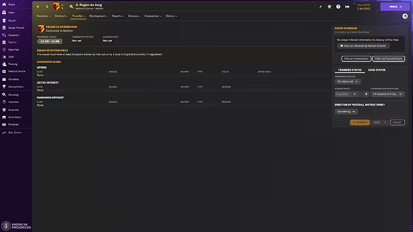为了让经理们更清楚地了解出售某位球员可以得到的经济回报,我们在每位球员的“转会”下拉菜单中添加了一个“询问经纪人转会市场兴趣”的选项。