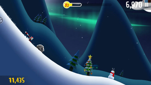 4、游戏屏幕上方会有此时的奖励状态,玩家通过在滑行中收集金币奖励、完成高难度动作等,可以填满奖励状态,从而激活各种高级工具例如火箭船等,还可以和企鹅、雪怪人一同搭载着火箭船奔向远方。