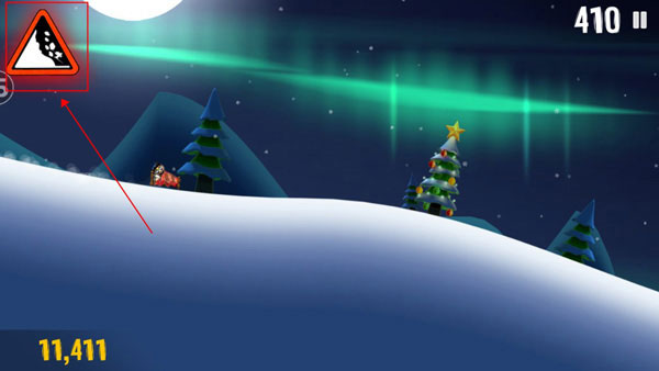 3、屏幕左侧上方的雪崩警示牌会在雪堆即将接近时不断地闪烁以示警告,即时你已经在视野中能够看到背后奔腾而来的大雪,如果此时爬起继续滑行,那么甩掉这近在咫尺的雪堆也并非不可能。