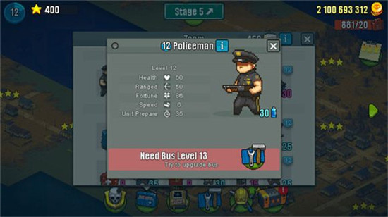 完成挑战之后我们可以使用收集到的物品给各个作战单位升级,可以提高他们的血量、攻击力等属性,当然了,我们的校车也是可以升级的。