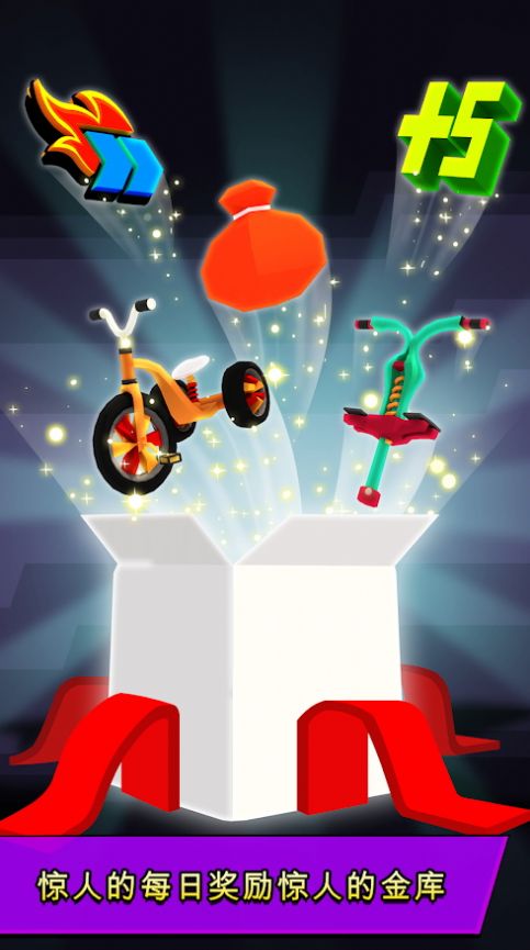 这款游戏采用跑酷玩法,玩家操控角色持续展开比拼,过程中可获取大量游戏金币。游戏结束后,还能收获各式各样的装备,像三轮车、平衡车之类都有机会得到,进而驾驶这些车辆在赛道上风驰电掣。