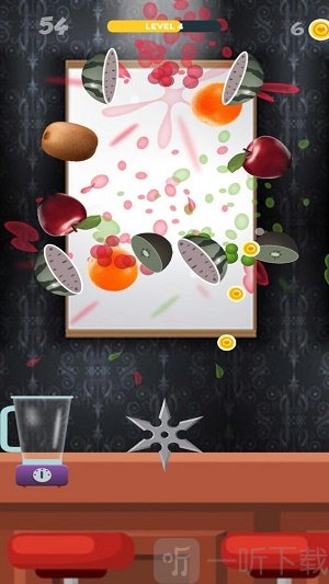 1. 在3D游戏画面中,各式各样的水果道具在空中跳跃,玩家需调整飞镖位置,从而实现最佳效果。