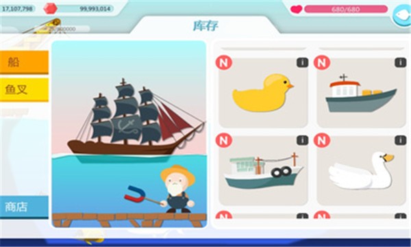1、更丰富多元的道具组合玩法。玩家在其中使用的钓鱼道具不只是鱼竿,还有许多别的,例如大型船只上的船锚、小鸭子、吸铁石等,这些道具能让玩家体验到与众不同的钓鱼乐趣。