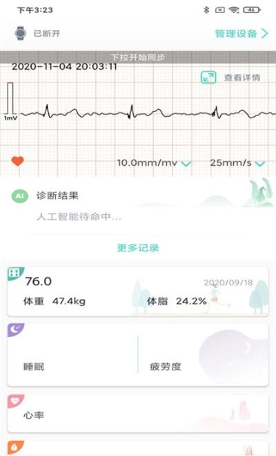 可对心率、心电、血压、血氧、体重、脂肪等健康指标予以检测。