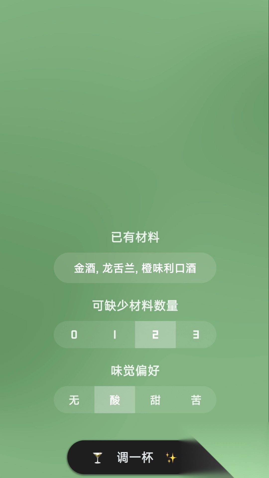 3、根据所添加的原料,系统自动推送与之对应的调酒清单,助力用户借助现有的材料完成调酒操作。