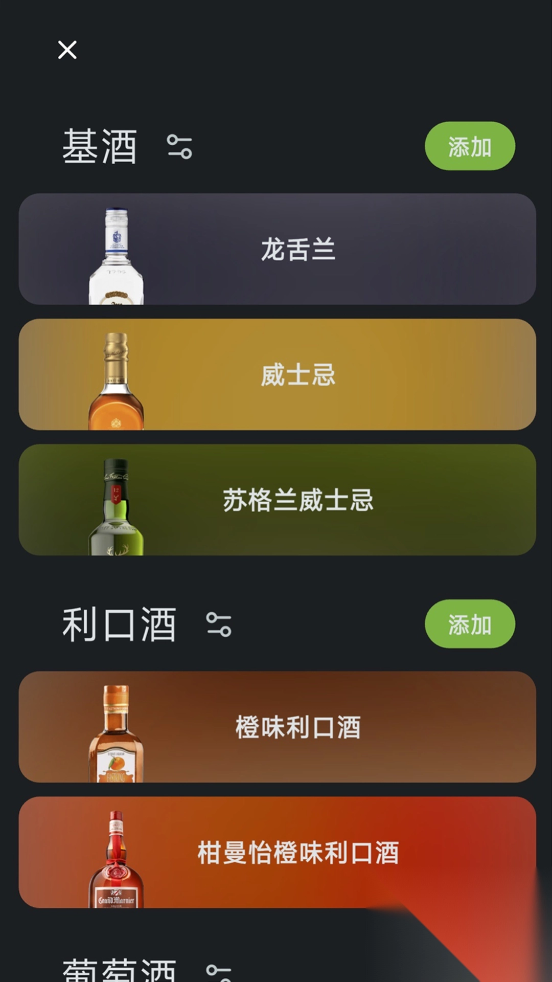 2. 平台支持添加您自身所拥有的原料,基于此,平台将自动推送与之适配的调酒清单,从而降低筛选成本。