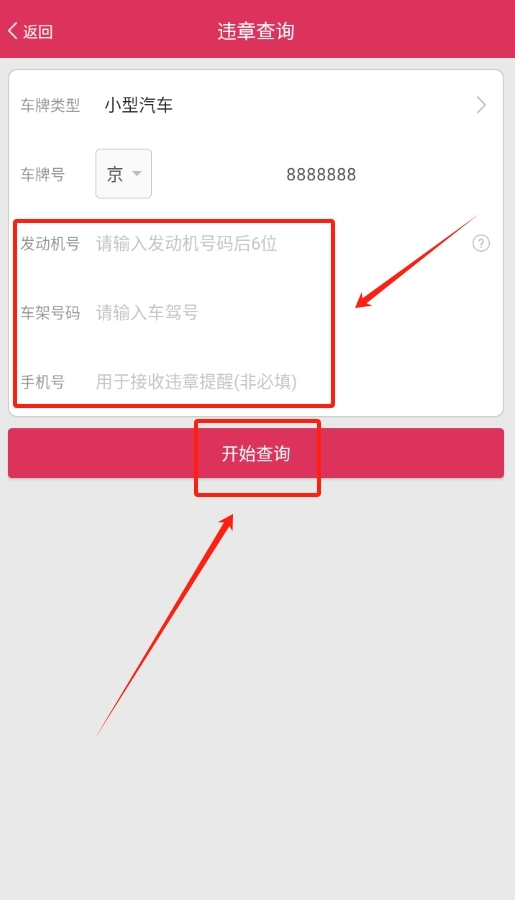 3、随后,在对应的位置输入发动机号与车架号,接着填写本人手机号,待所有信息确认准确无误后,点击“开始查询”。