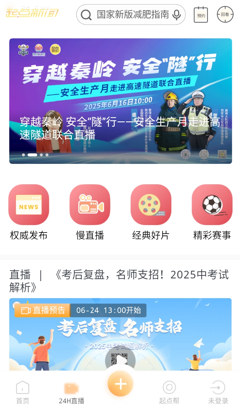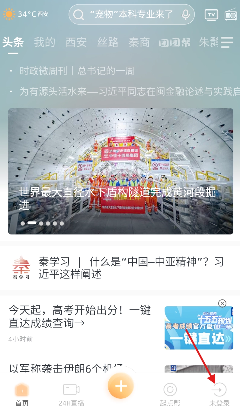 1、打开起点新闻软件,点击导航栏中显示的 “未登录” 选项。