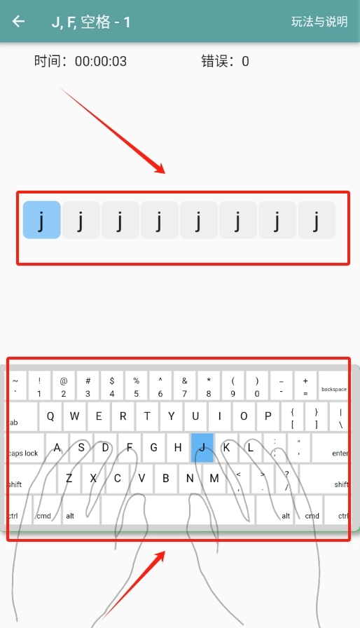 3、关卡选定后,屏幕上会呈现出正确的指法图示,依照图示将手放置到相应的键盘位置,即可开始练习。