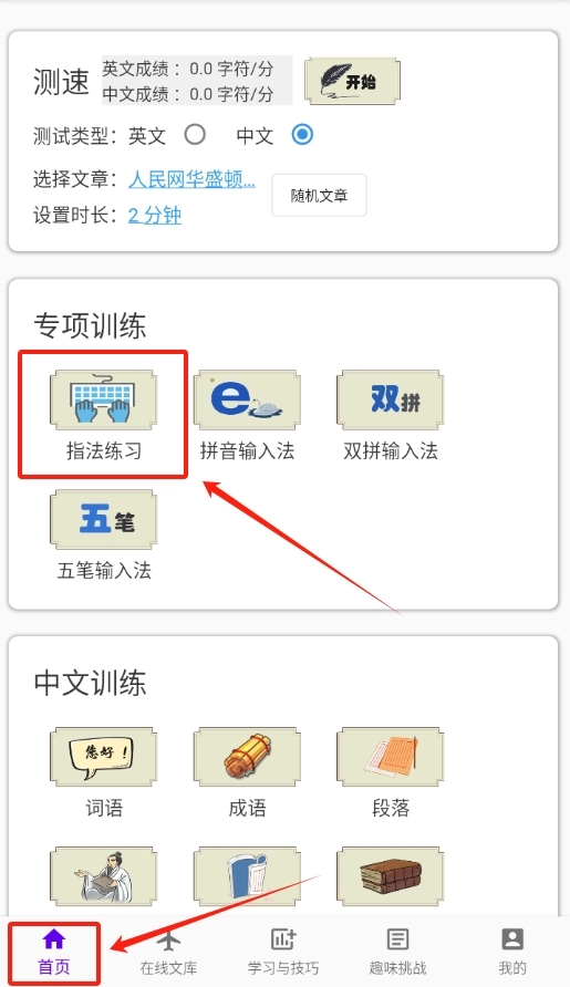 1、打开打字训练软件,进入首页后,直接找到 “指法练习” 按钮,点击进入练习界面。