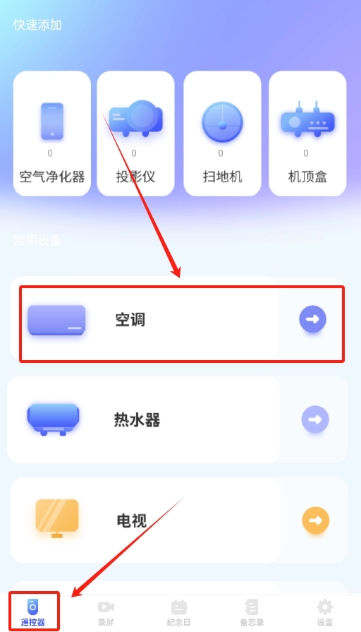2. 遥控设备添加操作步骤:轻点“添加设备”按键,挑选家电类别,依照提示匹配品牌或者学习遥控信号。