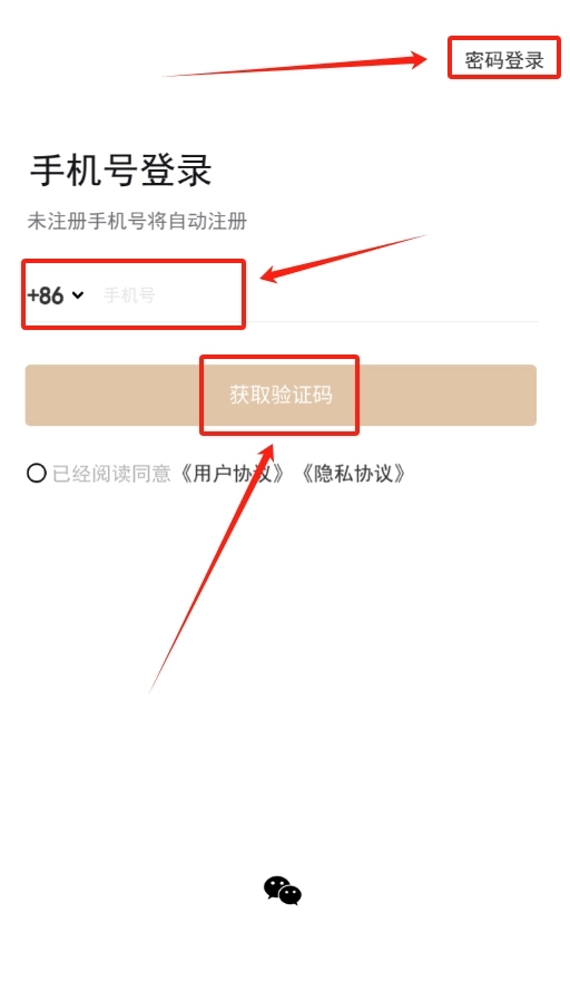 1、打开软件后,在登录页面输入手机号和收到的验证码完成登录。