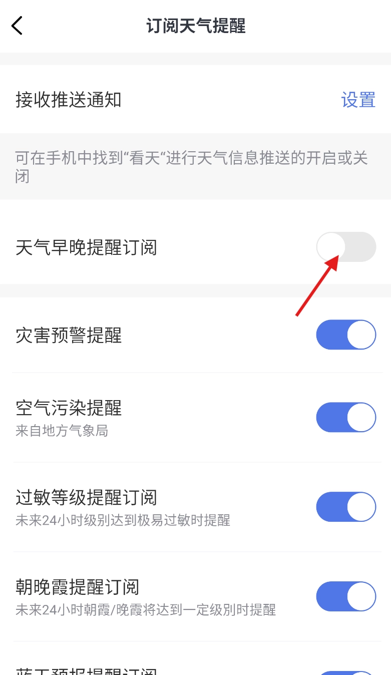 4、于天气提醒设置界面内,寻得“天气早晚提醒订阅”标识,点击该标识旁边的开关,便能完成订阅操作。