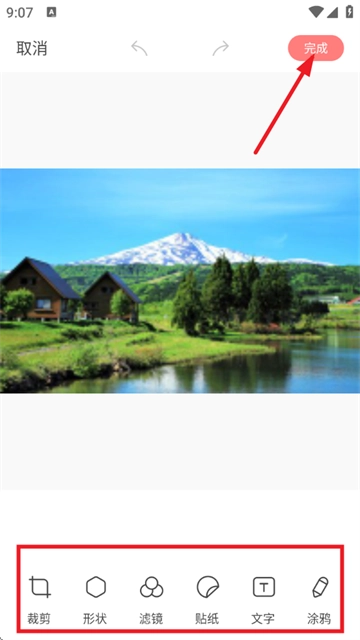 3、选择照片之后,可以编辑该图片的形状、滤镜、贴纸等等,编辑好之后点击完成即可;