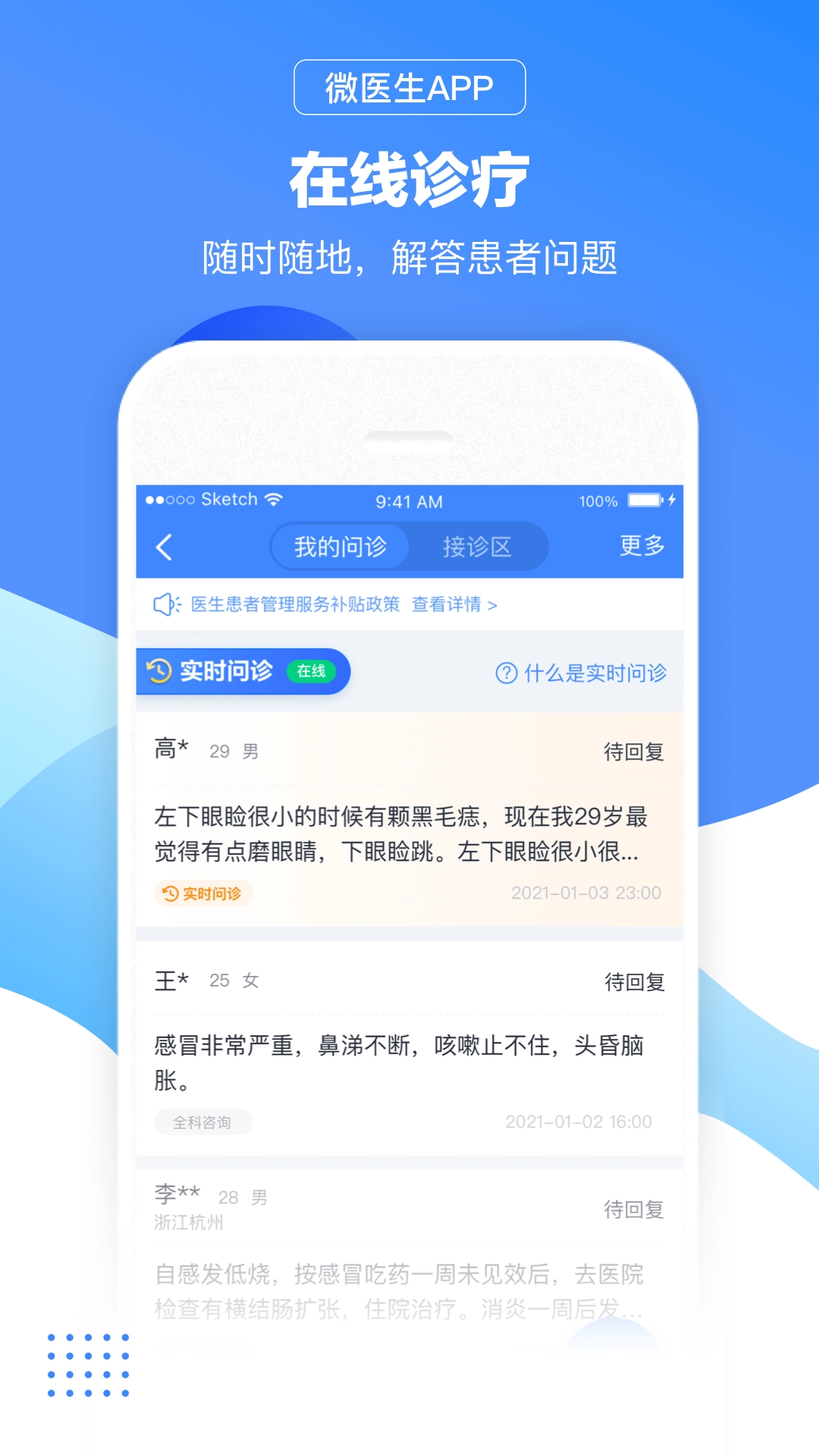 1、【患者问诊】向患者在线供应图文、电话以及视频问诊等服务。