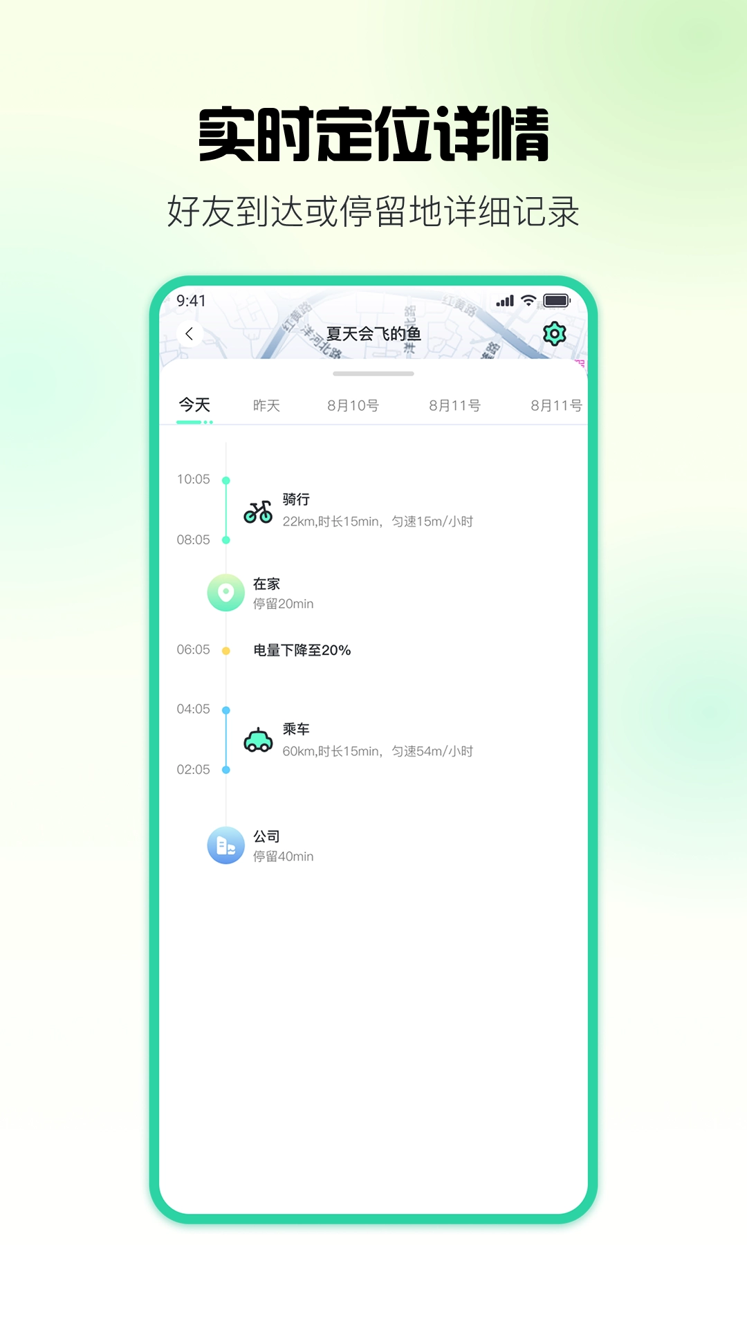3、状态自动报备:实时获取好友位置信息,包括去过的地点、停留时长,以及出行方式(如步行、骑行、乘车等)。