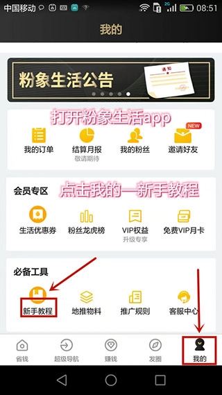 1. 打开粉象生活App,点击“我的”,往下拉一点,找到“新手教程”并点击进入,这时你会看到三个标题,分别是新手教程、版本更新以及粉象生活小技巧。无论你是刚接触粉象生活,还是已经做了很长时间,都建议花十分钟将其全部看完。