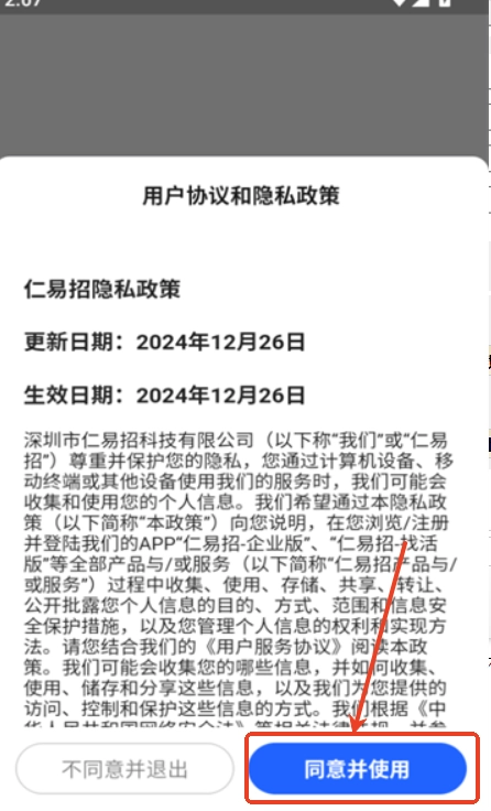 1、进入后查看相应的协议及隐私政策,若觉得无问题,直接点击“同意并使用”就行。