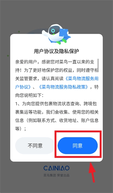 接着打开CAINIAO ,首先要同意用户协议与隐私保护。