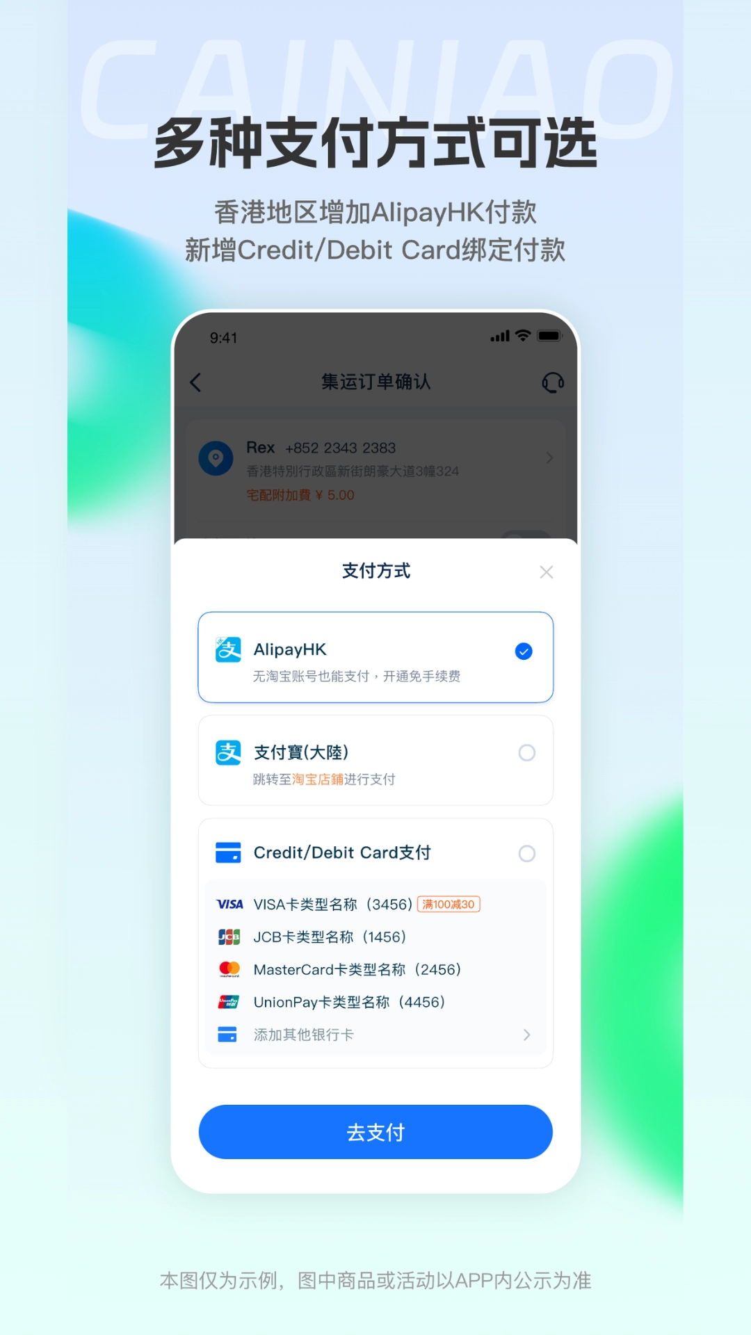 香港地区新增AlipayHK付款方式,同时增添Credit/Debit Card绑定付款选项。