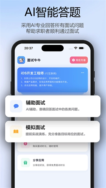 1. AI智能答题:运用AI给出专业解答,针对各类面试问题为求职者提供助力,助其顺利通过面试。