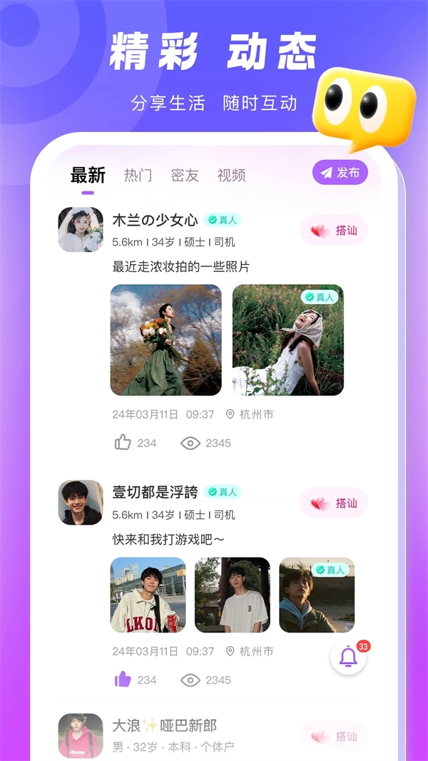 6、发布动态:用户可上传视频或图片,发布精彩动态以记录日常生活,分享美好瞬间。