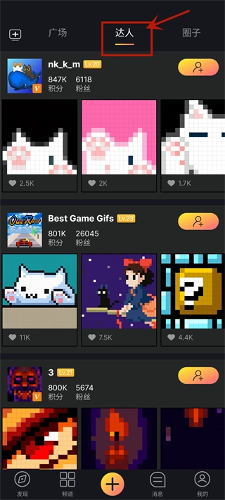 2、进入应用后,点击中间方块按钮可以查看广场的各种动态,查看别人的作品。
