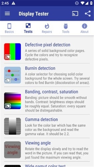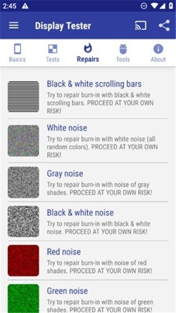 Display Tester烧屏修复中文版的最新版本,是一款专门针对安卓设备打造的屏幕检测与修复工具。其主要功能在于对LCD/OLED屏幕的显示性能进行检测,并解决烧屏问题。这款软件利用纯色背景检测方式,能够迅速确定屏幕存在的问题,非常适合用户自行检查手机或平板屏幕是否有显示异常,以及是否出现触控故障。