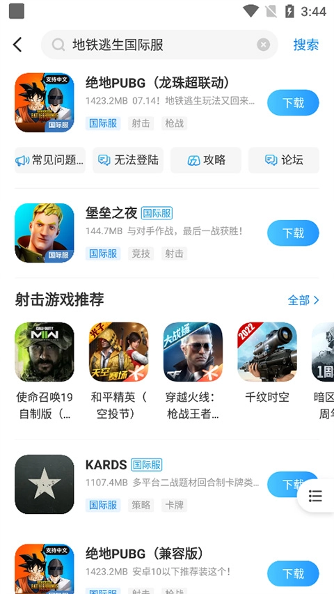 玩家在首页的搜索框中,搜索“地铁逃生”或“pubg”,就能找到对应的国际服游戏供自己体验。