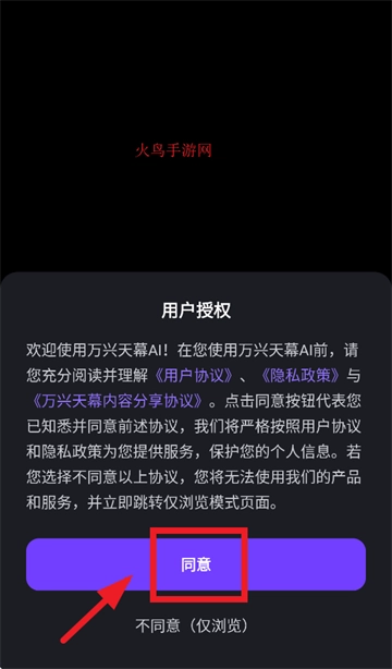 安装并打开万兴天幕AI,在用户授权提示界面点击同意