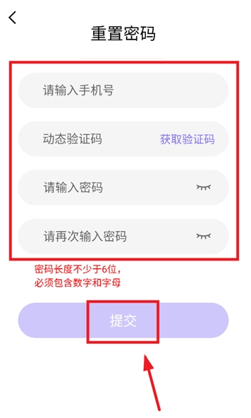 输入手机号,动态验证码,密码,点击提交即可。