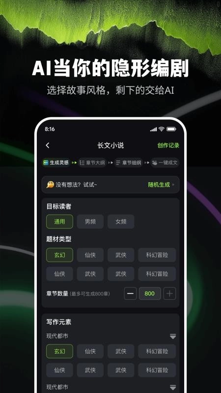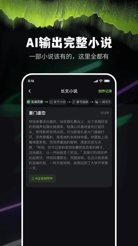 能够助力用户轻松开启AI创作模式,如此一来,无需你手动编辑,软件便会自动完成小说创作。