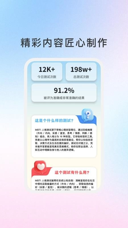 这款软件全面覆盖了MBTI性格类型的各个维度,以此保障测试结果兼具全面性与准确性。