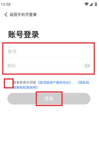 请输入账号、密码,勾选“登录即表示同意《提词蛙用户服务协议》《隐私权政策和权限说明》”,然后点击“登录”即可。