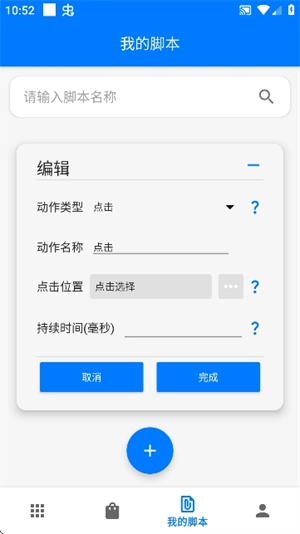 7、点击【添加】按钮,进入脚本编辑界面,在该界面中设置动作类型、名称、点击位置、持续时间等相关参数,全部设置完成后,点击【完成】按钮即可。