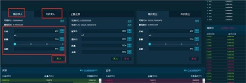 2、以TCH/BTC为例,在红色框区域填入买入或卖出的数量(当前最小交易单位为0.001),然后点击下方的红色或蓝色按钮,这样就挂单成功了。当出现对应价格的卖方或买方挂单时,系统会自动进行撮合成交。