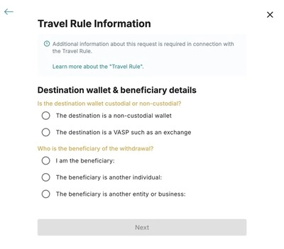 2、挑选网络协议,填入您期望接收Tether代币的钱包地址,以及打算汇入Tether的法定货币总金额。请选择即将接收的Tether代币与即将进行电汇的银行账户,之后点击下一步。