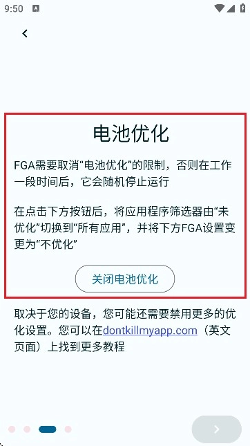 5、电池优化:需取消FGA “电池优化”的限制,不然工作一段时间后,它会随机停止运行。点击下方按钮,把应用程序筛选器从“未优化”切换为“所有应用”,并将下方FGA设置改为“不优化” 。
