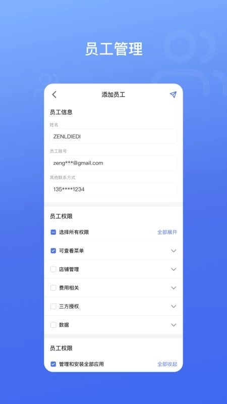 实现在线添加并管理全部员工信息,于员工管理中心能够随时查看店内所有员工信息。