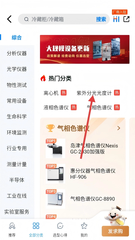 2、在仪器分类页面的热门分类中,点击目标仪器分类,进入该类仪器展示页面。