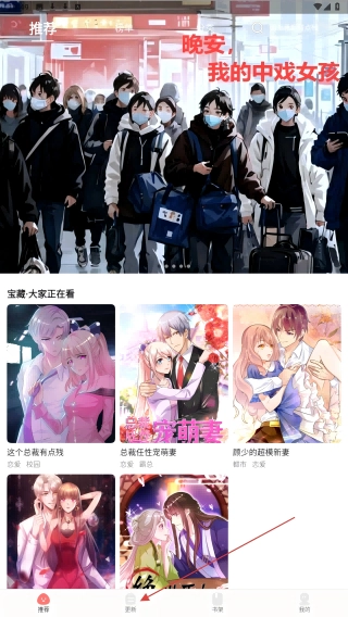 1、打开好看漫画后,首页展示推荐漫画,可点击底部【更新】查看新内容。