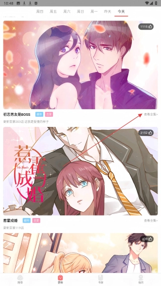 2、在【更新】页面,找到想看的漫画,点右侧【查看全集】可浏览完整内容。