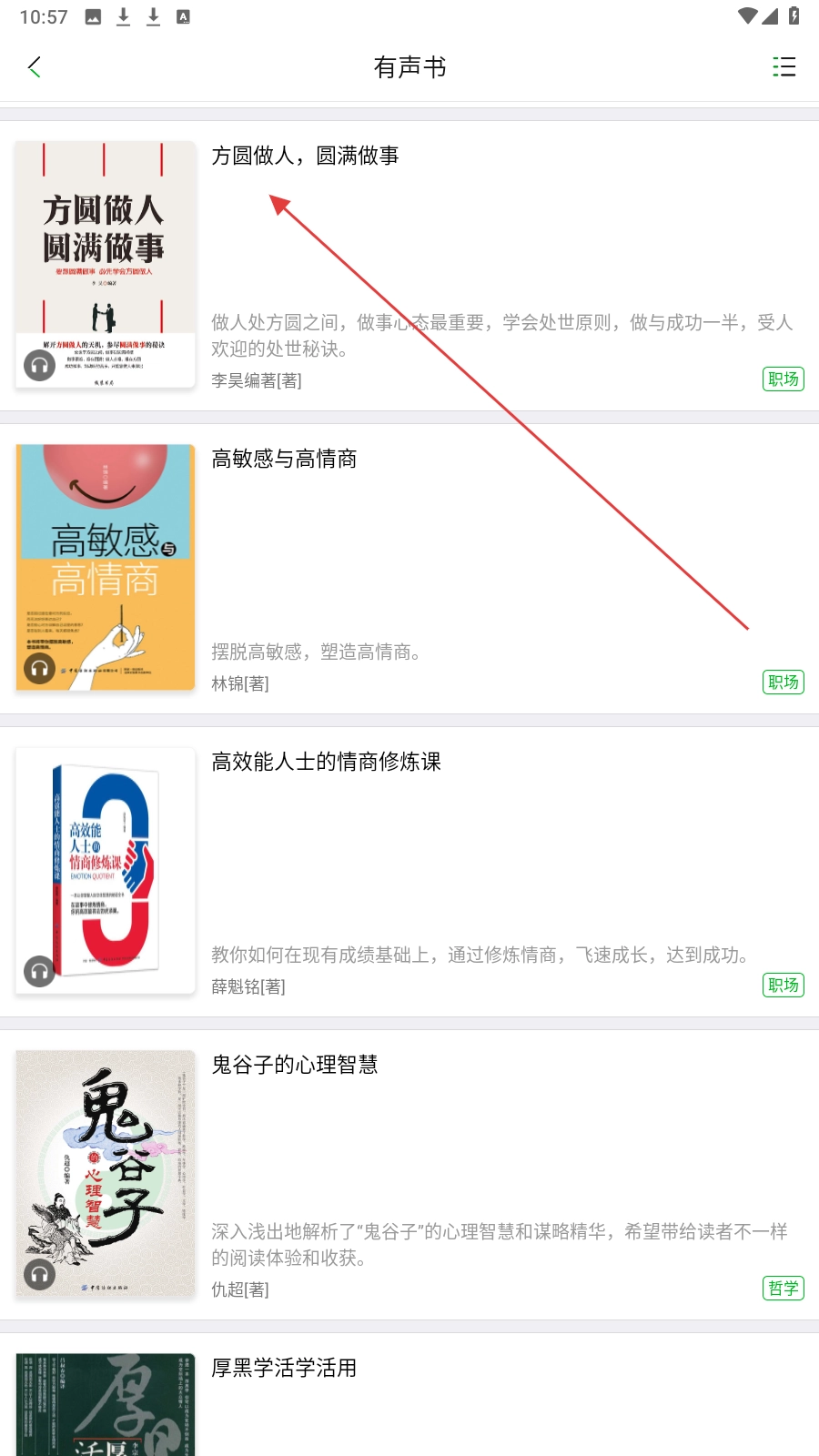 2、在【有声书】板块,点选感兴趣的书籍,如【方圆做人圆满做事】进入详情页。