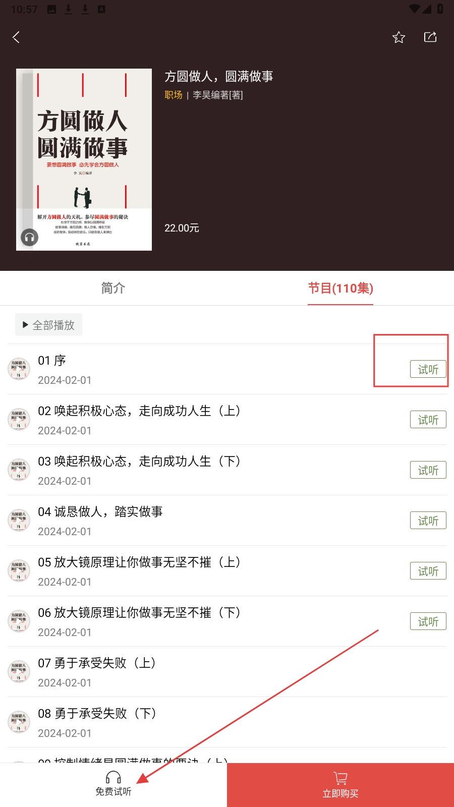 3、书籍详情页有【免费试听】按钮,点击可收听音频内容,感受书籍风格。