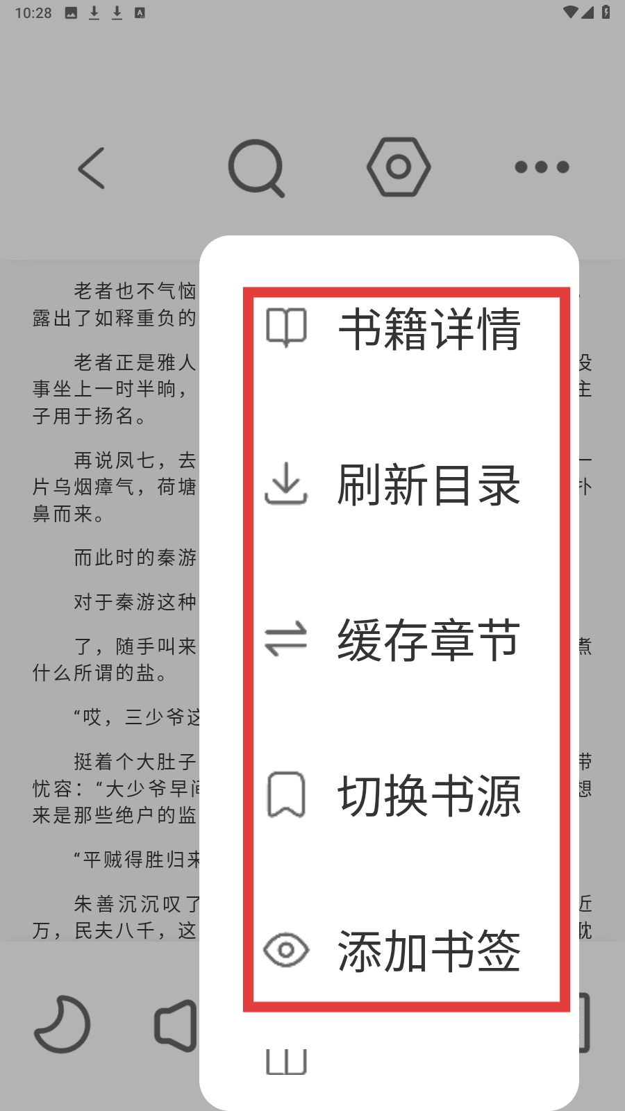 4、在阅读界面,可使用功能菜单进行操作,如查看书籍详情、刷新目录等。
