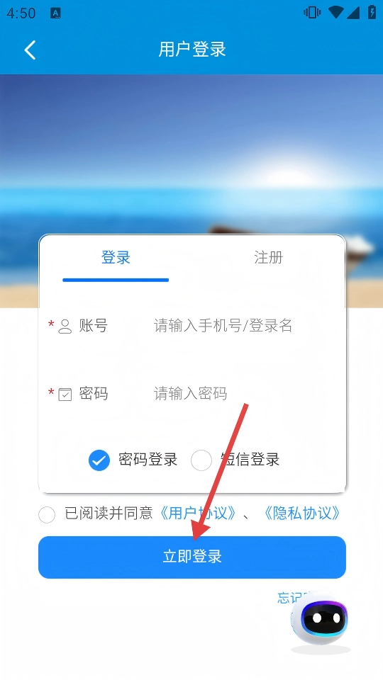 4、在用户登录页面,输入账号和密码,点击【立即登录】,完成登录后进行行程定制。